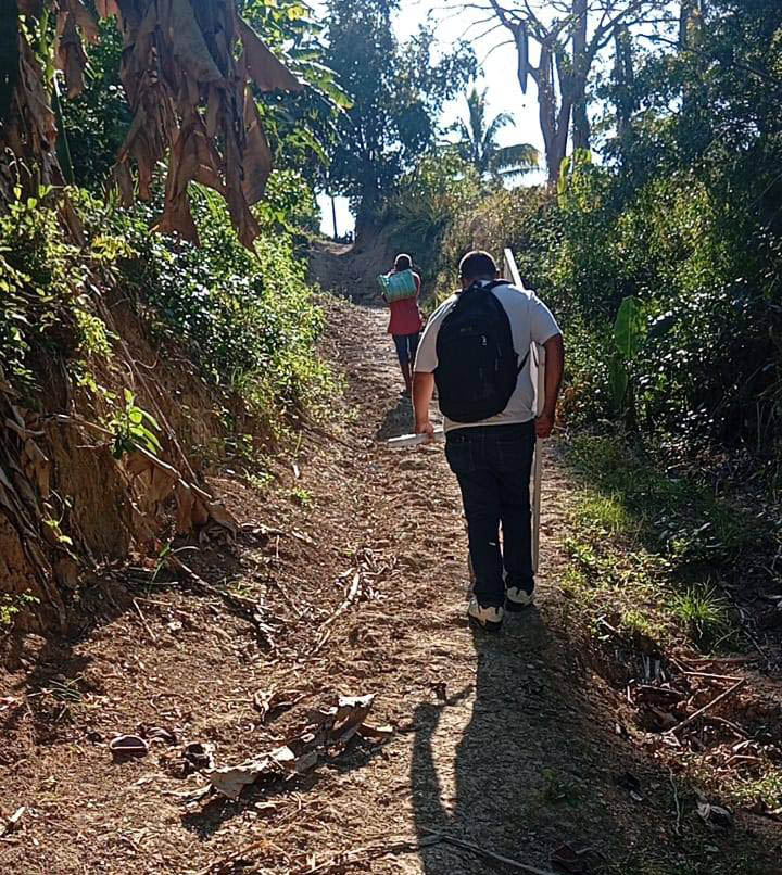 Su casa, distante a más de cuatro kilómetros de la carretera, obliga a los especialistas a caminar largas distancias. Cruzan ríos y atraviesan terrenos a los que solo mulos y caballos pueden acceder. Un trillo de tierra y piedras serpentea ante ellos.
