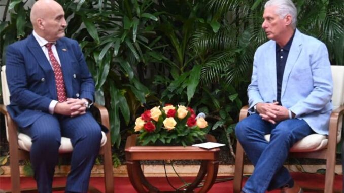 Díaz-Canel manifestó el agradecimiento en un encuentro de cortesía en el Palacio de la Revolución con el presidente del Colegio, Fernando Jesús Santiago Ollero.