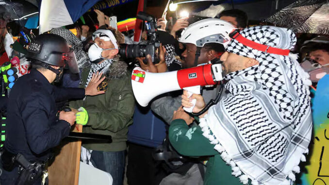 Más de un centenar de manifestantes pro palestinos instalaron campamentos en Dickson Plaza, Kerckhoff Patio y Shapiro Courtyard, reseñó la publicación.