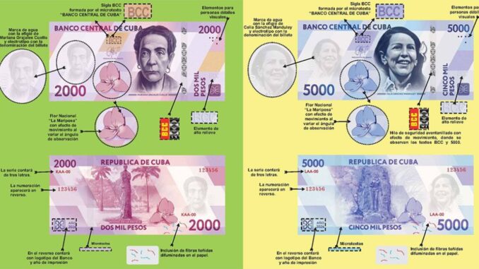 La Habana-. El Banco Central de Cuba (BCC) anunció hoy la puesta en circulación en el país de dos nuevos billetes de alta denominación, de dos mil y cinco mil pesos cubanos (CUP).