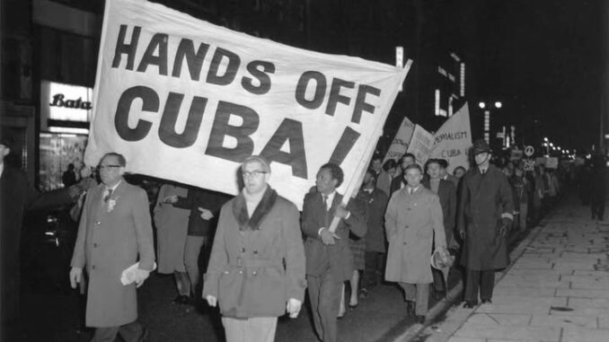 Recuerda varias muestras de apoyo y solidaridad que han intercambiado ambos pueblos, incluida la consigna “Hands off Cuba!” (Manos fuera de Cuba), en los tempranos días del Fair Play for Cuba Committee.