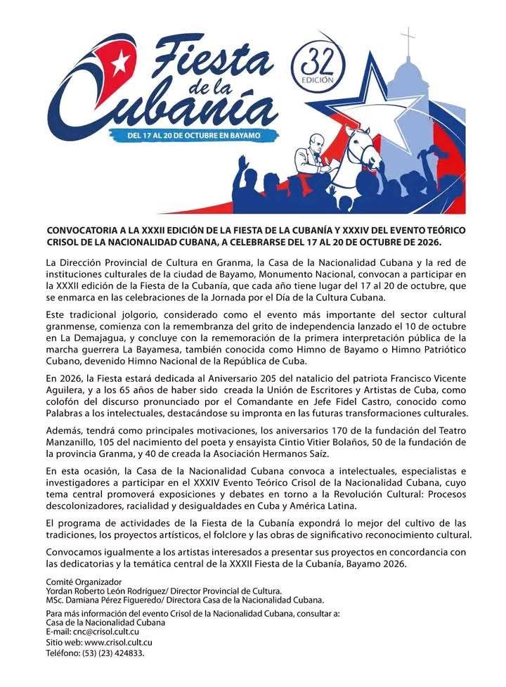 Con este espectáculo quedó oficialmente clausurada la XXXI Fiesta de la Cubanía y a su vez Yordan Roberto León Rodríguez, director provincial de Cultura en Granma, lanzó la convocatoria para la próxima edición y la 34 del evento teórico Crisol de la Nacionalidad Cubana, a celebrarse del 17 al 20 de octubre de 2026.
