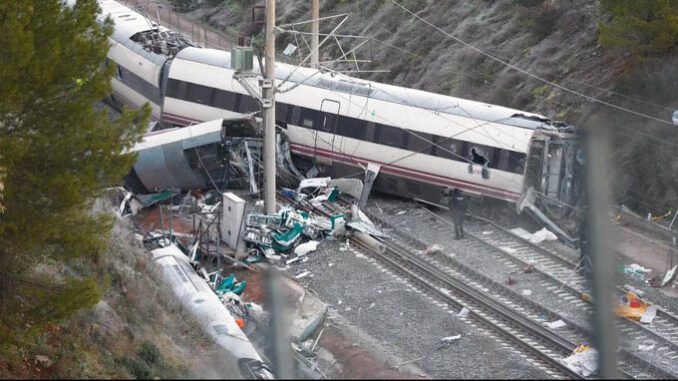 El siniestro ferroviario ocurrió anoche en Ademuz, Córdoba, Andalucía, en el sur de España cuando un tren de la compañía Iryo con destino a Madrid, con 317 personas, descarriló sus tres últimos vagones e invadió la vía contigua.