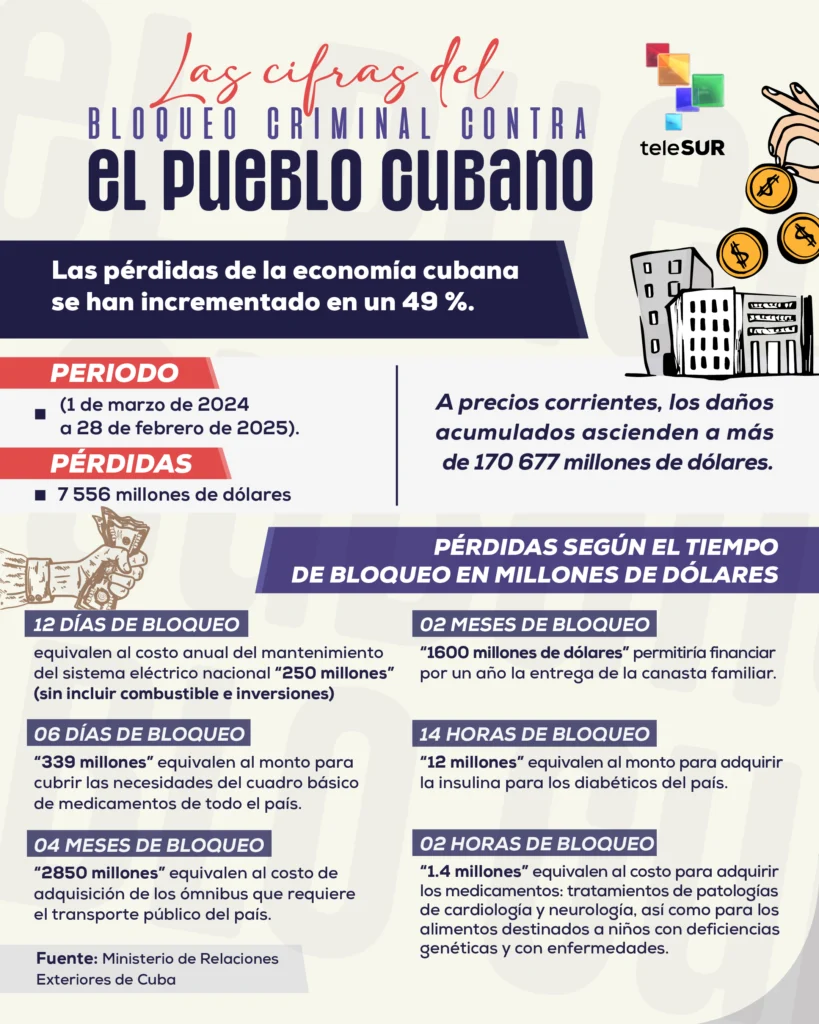 El canciller cubano Bruno Rodríguez Parrilla , dio a conocer el informe que da cuenta de las millonarias cifras en pérdidas y daños ocasionados, y en los sectores sensibles que impacta como la salud, la alimentación, y un valor preciado en éstas épocas como es el acceso a la energía eléctrica.