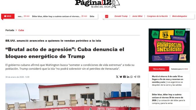 “Con este nuevo bloqueo energético, la administración Trump busca forzar un cambio de gobierno aprovechando la fragilidad económica que atraviesa la isla”, advierte Página12.