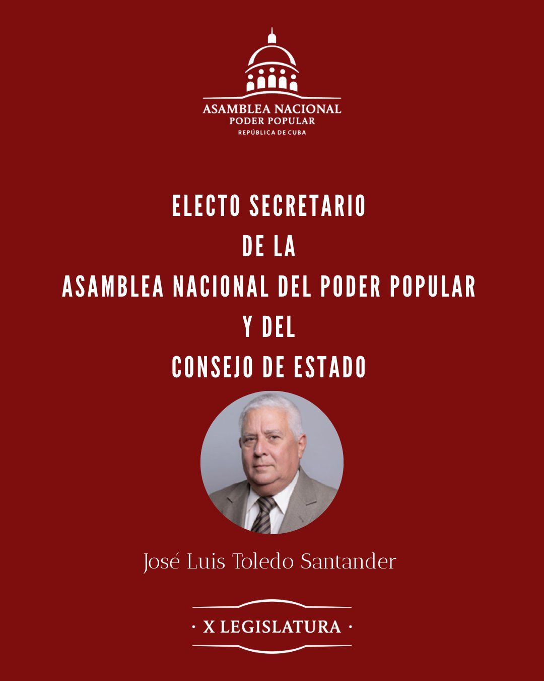 La presidenta del Consejo Electoral Nacional, Alina Balseiro, informó que el diputado José Luis Toledo Santander fue electo para ocupar el cargo de Secretario de la Asamblea Nacional del Poder Popular, que lo es a su vez del Consejo de Estado. La propuesta fue realizada durante el sexto período de sesiones ordinarias de la X Legislatura del Parlamento.