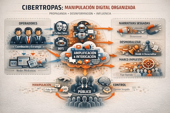 El concepto de cibertropa, elaborado por el Oxford Internet Institute (OII), ofrece un marco útil para entender este fenómeno. Se trata de estructuras organizadas de intervención política en el entorno digital —formadas por operadores humanos, cuentas coordinadas, perfiles falsos, automatizaciones y nodos mediáticos afines— cuyo objetivo no es deliberar ni informar de manera equilibrada, sino influir, intoxicar, amplificar narrativas, fijar marcos interpretativos, desmoralizar al adversario y alterar la percepción pública de los hechos.