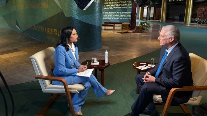 El presidente de Cuba, Miguel Díaz-Canel, afirmó que no renunciará a su cargo, durante una entrevista concedida al programa Meet the Press de la cadena estadounidense NBC News. Ante la interrogante de la periodista Kristen Welker sobre si dimitiría para «salvar a su país», el mandatario respondió que la rendición no forma parte del vocabulario revolucionario.