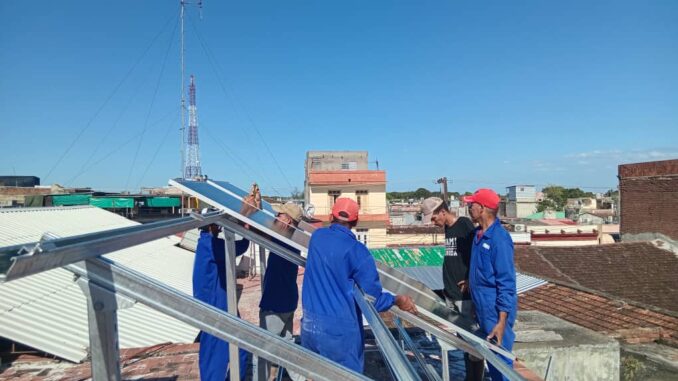 Especialistas de la corporación Copextel Granma acoplan los paneles solares, capaces de generar unos dos kilowatt, energía que asegurará la programación habitual de los medios de difusión sin interrupciones durante el día y parte de la noche, así como preservar la fidelidad de la audiencia.